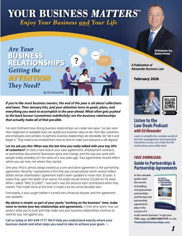 In addition to our e-newsletter, we also send a print newsletter, Your Business Matters, to past and present clients and members of our referral partner network. The print newsletter is a great way for us to keep our wider network up to date on the most pressing legal challenges facing business owners as well as what’s happening here at Alexander Business Law.